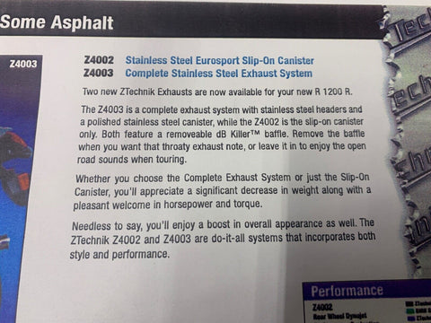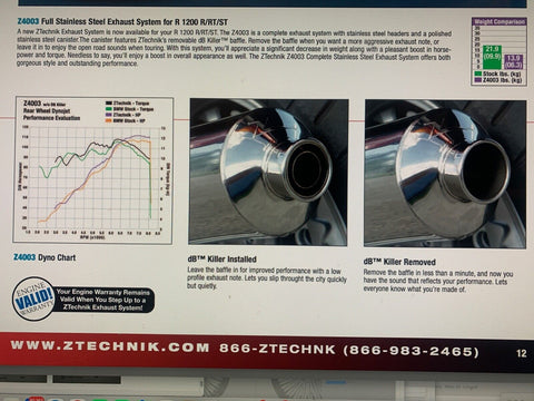 R1200RT - Full Exhaust System, Stainless Steel Ztechnik Z4003 ultimate stainless power system !  Take a look at the new Z4003 Performance Exhaust System for the BMW R1200R/ST/RT. This sleek exhaust consistently provides a performance boost of 5 HP and 2 ft. lbs. of torque in a lightweight, well-engineered package. A close look at the quality shows no short cuts taken -- the craftsmanship of the entire system is refined for power and appearance. Equal length header pipes feature precision machined and welded couplers, providing you the benefit of a perfect fit and a tight, long lasting seal. The polished stainless steel muffler also features a removable dB Killer for an aggressive sound to match its performance. As with all ZTechnik Exhaust Systems, your engine warranty remains valid after the system is installed! The Z4003 Performance Exhaust System weighs 8 lbs. less than the OEM system, has a slim, refined profile, and works with the stock centerstand built by Leo Vinci who make the Italian BSB and world super bike exhausts for guys like Valentino Rossi you can not get any better than this !